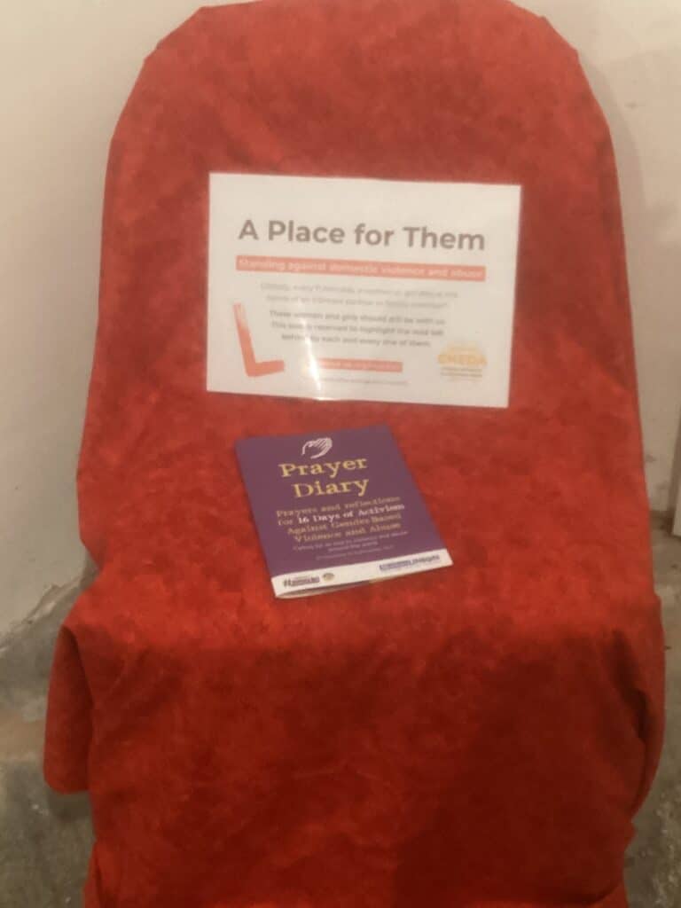 Each year during the UN’s 16 Days of Activism against gender-based violence, we join in with the Red Chair Project: an international campaign to raise awareness of domestic abuse and commemorate the women and girls lost each year through gender-based violence. Churches and individuals from across the UK and beyond get involved by designating a Red Chair – take a look at the gallery below.