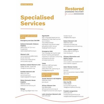 Download these PDFs containing contact details of various specialised domestic abuse services, including services for men, children and young people, and BME women.